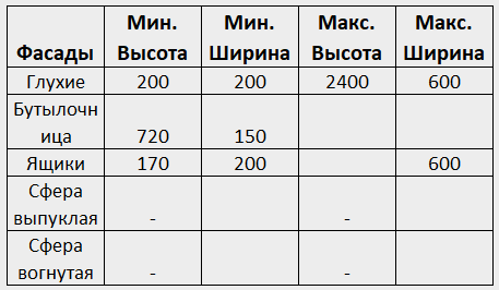 На бутылочнице шириной 150 мм отступы сверху и снизу согласно основной фрезеровке, слева и справа 40 мм. Отступы на фасадах до начала фрезеровки - 62 мм. На сферах данная фрезеровка не предусмотрена. Виды ручек, используемые на этом фасаде: с присадкой, накладные, врезные. Установка стяжек-выпрямителей уточнять у менеджера. Радиусные фасады на данной фрезеровке не предусмотрены.