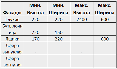 На бутылочнице шириной 150 мм отступы сверху и снизу согласно основной фрезеровке, слева и справа 40мм. Отступы на фасадах до начала фрезеровки - 62 мм. На сферах данная фрезеровка не предусмотрена. Виды ручек, используемые на этом фасаде: с присадкой, накладные, врезные. Установка стяжек-выпрямителей уточнять у менеджера. Радиусные фасады на данной фрезеровке не предусмотрены.