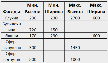 На бутылочнице шириной 150 мм делается тонкая обводка. Отступы от края до фрезы слева и справа 40 мм, сверху и снизу согласно основной фрезеровке. Отступы на фасадах до начала фрезеровки - 62 мм. На ящиках отступы сверху и снизу - 30 мм, слева и справа согласно основной фрезеровке. Виды ручек, используемые на этом фасаде: с присадкой, накладные, врезные. Установка стяжек-выпрямителей уточнять у менеджера. На радиусных фасадах витрины делаются без паза под стекло и без переплета. Радиусные фасады изготавливаются на плитах: 16 мм и 18 мм.