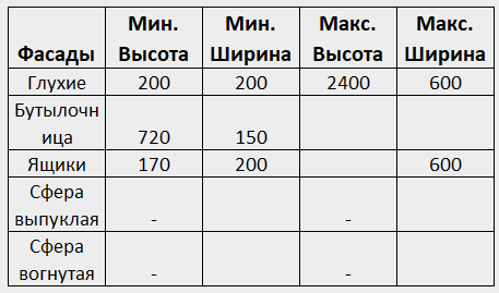 На бутылочнице шириной 150 мм отступы до начала фрезы сверху и снизу согласно основной фрезеровке, слева и справа - 40 мм. Отступы на фасадах до начала фрезеровки - 70 мм. На ящиках отступы - 70 мм. На сферах данная фрезеровка не предусмотрена. Виды ручек, используемые на этом фасаде: с присадкой, накладные, врезные. Установка стяжек - выпрямителей уточнять у менеджера. Радиусные фасады на данной фрезеровке не предусмотрены.