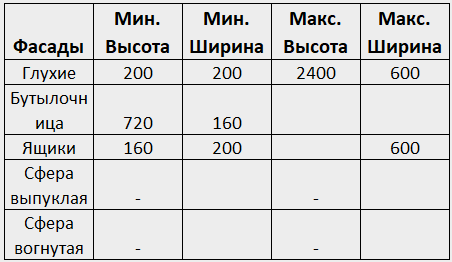 Данная фрезеровка делается на фасадах высота которых меняется с шагом 20. Шаг между полос 20 мм. Отступ до начала фрезеровки - 56 мм. Направление полос на данной фрезеровки горизонтальное. Полосы делаются на глубину 1.5 мм. Витрины делаются мыльные. Отступ до выреза – 60 мм. На бутылочнице отступы слева и справа - 40 мм, сверху и снизу согласно основной фрезеровке. Виды ручек, используемые на этом фасаде: с присадкой, накладные, врезные. Установка стяжек - уточнять у менеджера. На радиусных фасадах данная фрезеровка не предусмотрена.