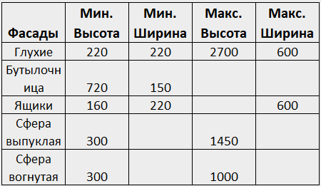 На бутылочнице шириной 150 мм делается тонкая обводка. Минимальный размер на глухих фасадах указан без внутренней обводки. Дополнение фасада внутренней обводкой зависит от размеров детали. Отступы на фасадах до начала глубокой фрезеровки -62 мм. До центра первой обводки 45 мм. На ящиках отступы сверху и снизу - 30 мм, слева и справа согласно основной фрезеровке. Минимальный размер ящика указан без внутренней обводки. Наличие обводки зависит от размеров ящика. Виды ручек, используемые на этом фасаде: с присадкой, накладные. Установка стяжек - выпрямителей уточнять у менеджера. На радиусных фасадах витрины делаются без паза под стекло и без переплета. Радиусные фасады изготавливаются на плитах : 16 мм и 18 мм.